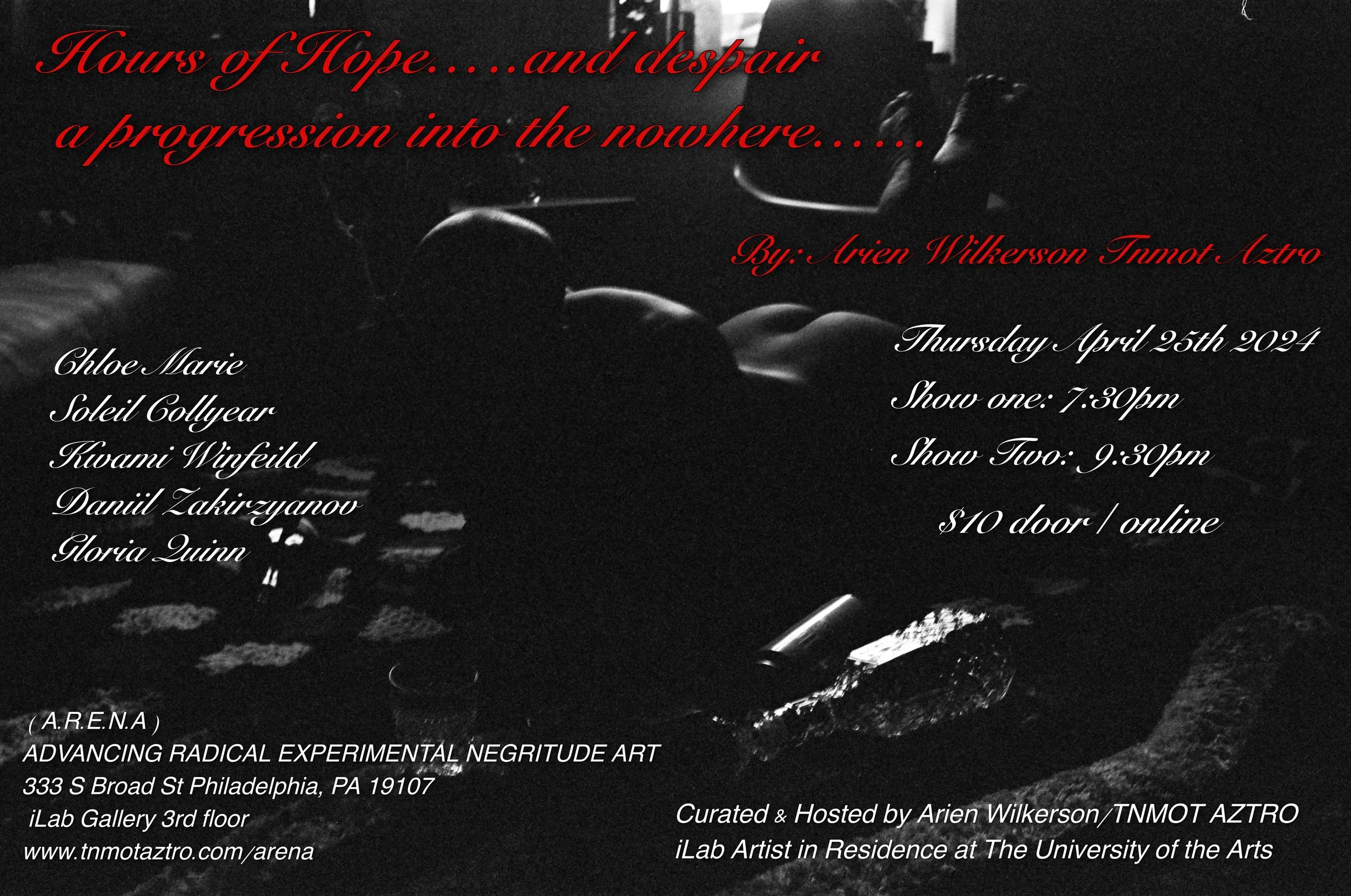 Arien Wilkerson, accompanied by their dedicated team of collaborators, is thrilled to present performance works that resonate with the ongoing research and dance theater piece "835 Hours of Hope and Despair." This responsive and spontaneous dance theater experience is continuing Wilkerson’s mission of delving into the societal conditions that perpetuate violence against Black individuals. It goes beyond isolated incidents of violence, instead exploring the deep-rooted urge to inflict harm—an emotional turmoil that transcends generations. During the iLAB residency, Wilkerson had the opportunity to develop new material, recruit additional dancers, and expand the movement vocabulary of the piece. This included refining set design, seating elements, character development, and actions within the performance. The program showcases fresh choreography by Wilkerson and dance collaborators Chloe Marie, Daniil Zakirzyanov, and Sol Collyear, accompanied by sound accompaniment from collaborator Kami Winfield and newcomer Gloria Quinn. "Hours of Hope... and Despair - a Progression into the Nowhere..." intricately weaves personal narratives into choreographic experiments, engaging and provoking the audience with innovative ideas within a welcoming atmosphere. This marks a shift from witnessing dance solely through Wilkerson's artistic lens to embracing a collective perspective from the performing artists. Join us for an unforgettable journey into the depths of emotion and expression.