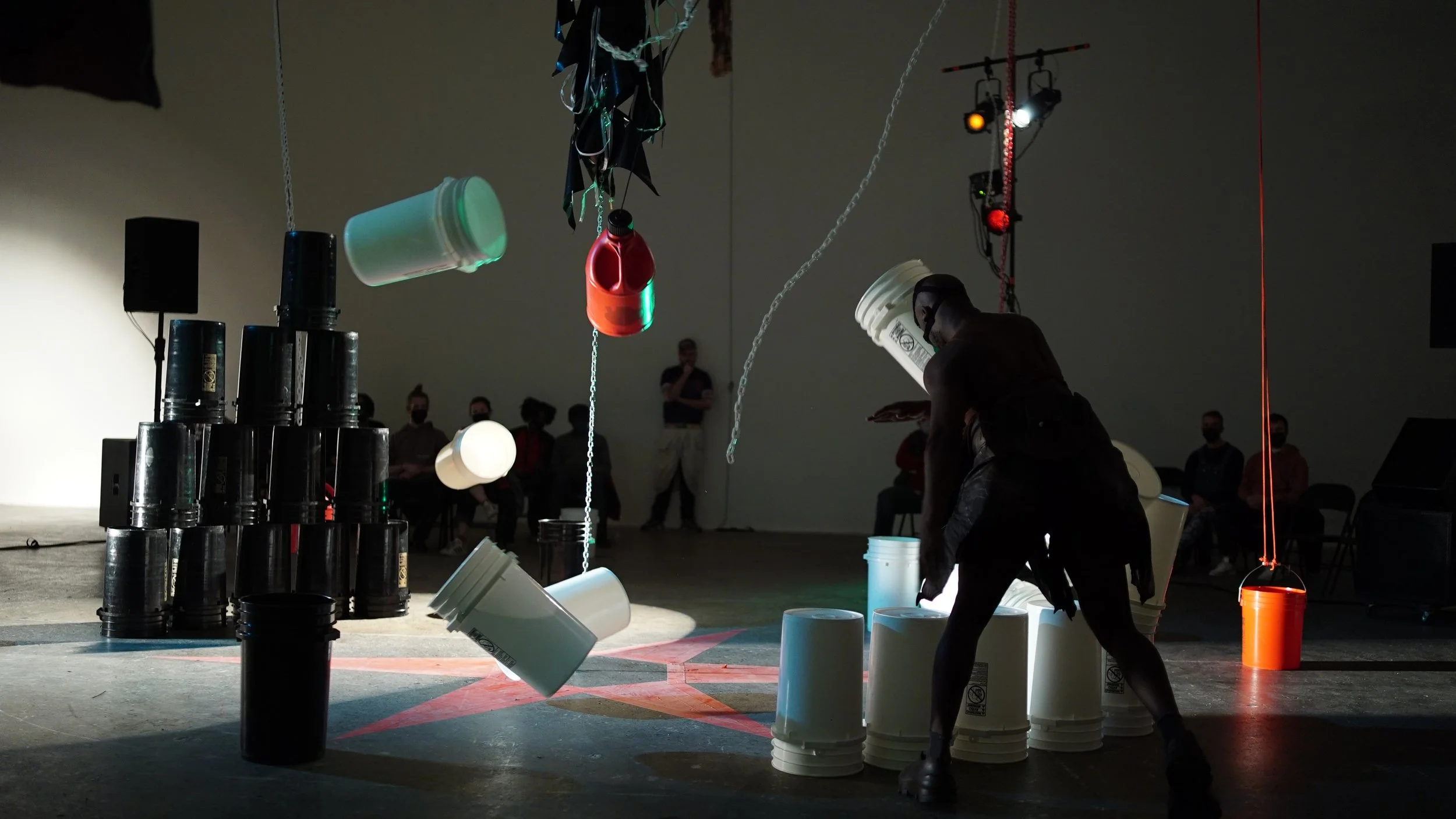EQUATORS forces you to remember toxic air quality, removal of land by redlining, slum clearance, eminent domain by giant re-construction, Philadelphia's flooding, and the way poverty is penalized through environmental means, like leaded water and buses that still use diesel fuel. With stacks of white and black industrial buckets, chains hanging from the ceiling, startling effects that viscerally simulate the presence of climate, destruction, and police presence, Equators is an electrifying display of powerful historical concepts infused with performance and stripped of any didacticism. The work is equally rooted in intersectional politics and deep-dive journalism. Of the piece’s primary sources was an Economic Policy Institute study called “The Making of Ferguson: Public Policy at the Root of Its Troubles” by the academic Richard Rothstein, which traces the police murder of Mike Brown in Ferguson, Missouri, in 2014 from an individual act of racism to a long history of segregationist legislation. Numerous contemporary studies show that communities of people of color face increased health risk due to pollution and natural disaster around the world. In parts of the U.S., they experience a lack of access to “salutogenic resources” like grocery stores, open spaces, clean water, hospitals, etc. The salutogenic model proposes that the goal of health research should be to identify, define, and describe pathways, factors, and causes of positive health to supplement our knowledge about how to prevent, treat, and manage negative health. Expanding the sociological concept of salutogenic resources to the possession of a vocabulary, a performance, and a world clinging for it's life EQUATORS is here and understands the stakes of climate change itself.